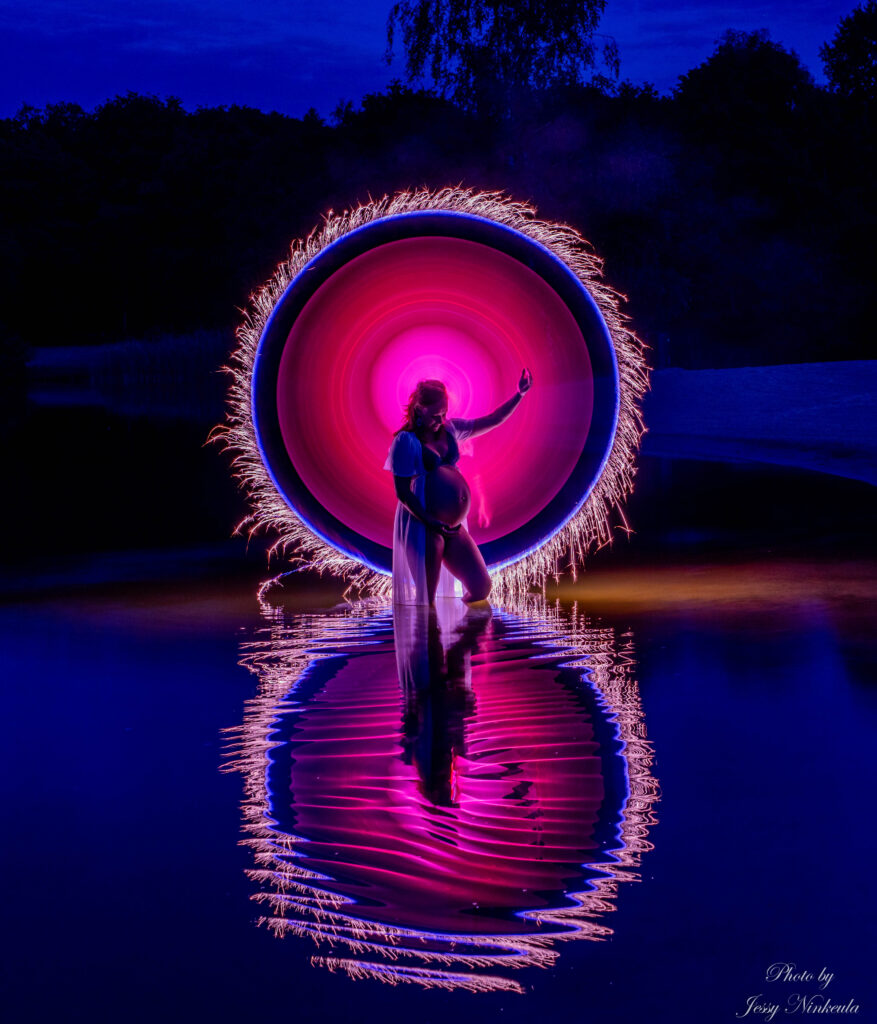 Ik ga aan de slag met een lichtbron en maak diverse contouren om je heen. Van belang is dat je stil kunt staan. Een foto maken duurt iets langer omdat het donker is en dan werk ik met langere sluitertijden. Ik maak diverse lichtgevende cirkels om je heen, waardoor je zwangere buik wordt omhuld met een aura van licht. Dit Creert een etherische sfeer en benadrukt het leven dat groeit binnenin.